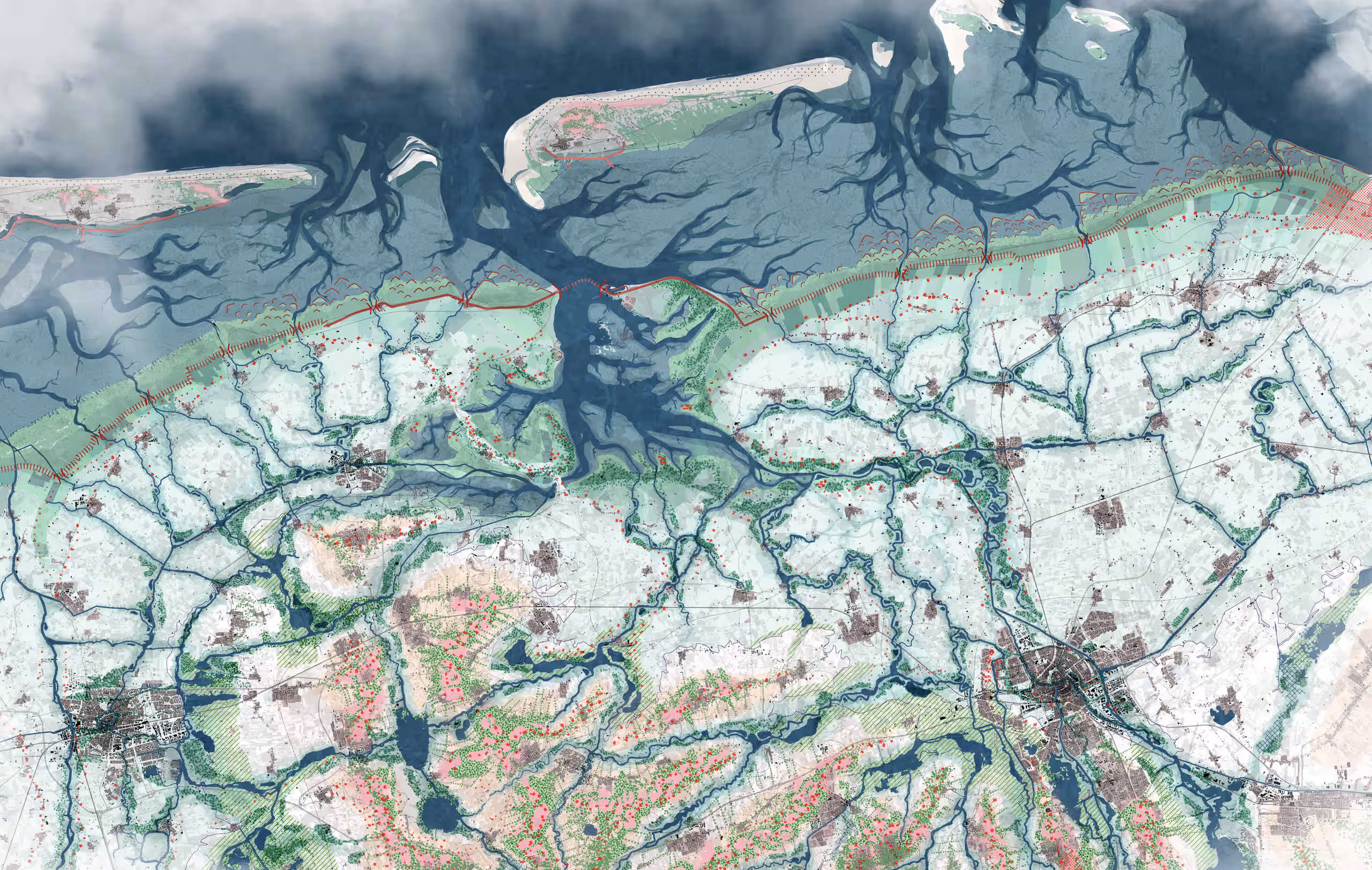 ‘Mijn afstudeerwerk is een ontwerpend onderzoek. Hierbij wordt het ontwerp als een instrument ingezet om kennis te ontwikkelen. Het is een iteratief proces, een herhalende cyclus waar theorie en landschappelijke analyse het ontwerp continu bijschaven. Door het landschap te lezen als een levende biografie kon ik begrijpen hoe historische structuren de logica van de regio bepalen. Deze ontwikkelingen zijn een essentiële bron van inzicht: vroege bewoners leefden op terpen met de dynamiek van de zee, en die kennis kunnen we vandaag vertalen naar moderne, veerkrachtige oplossingen. Door te redeneren uit de logica van het landschap, zijn niet langer de politieke grenzen leidend, maar de geomorfologische grenzen zoals stroomgebieden van rivieren en de specifieke landschapstypen die zich hierlangs bevinden.’
