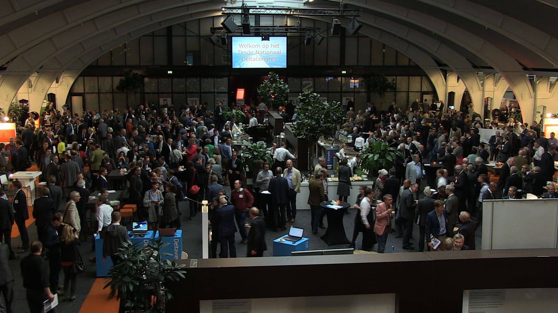 (Op een scherm staat: Welkom op het Zesde Nationaal Deltacongres.)