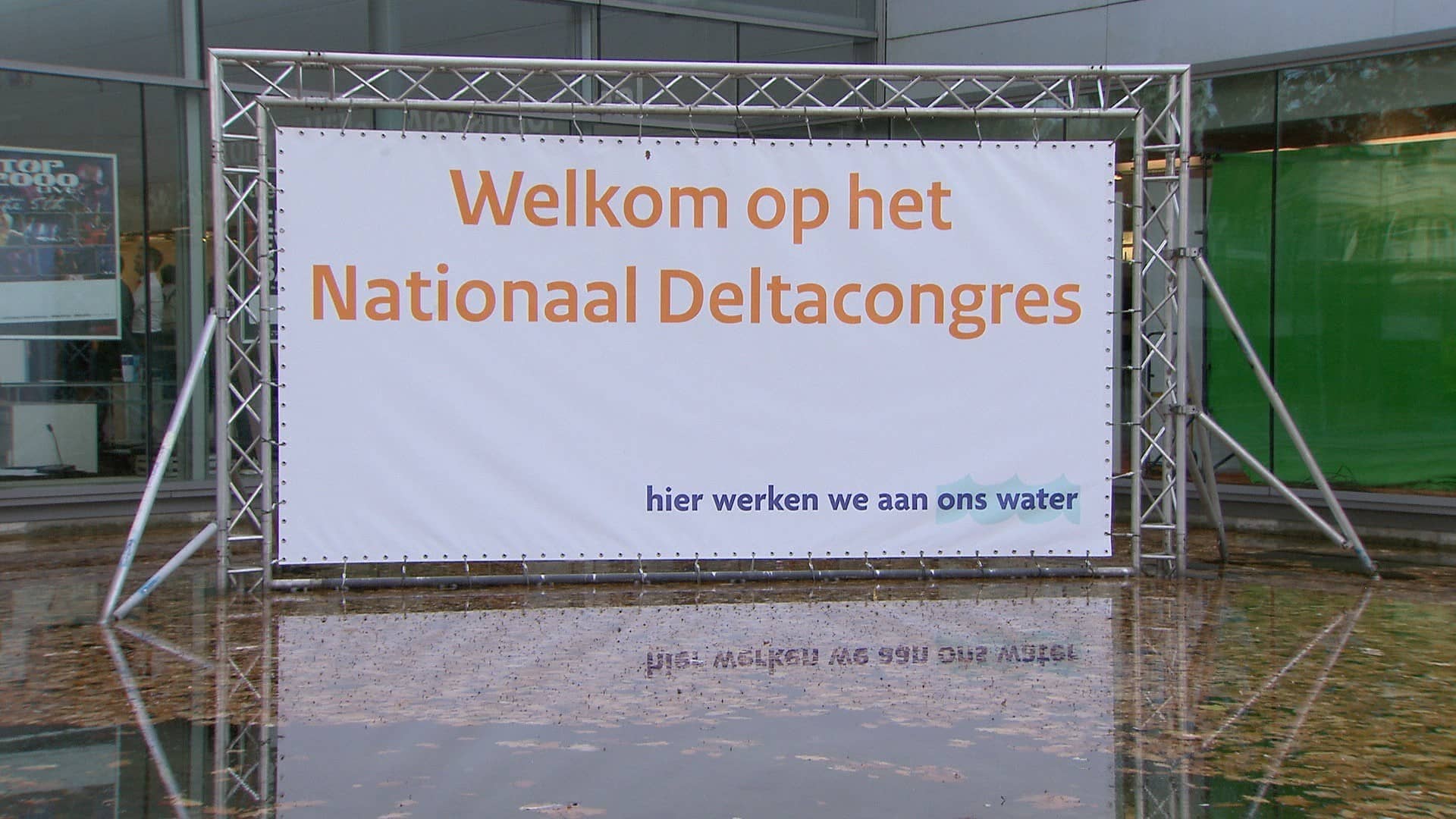 (Op een groot, wit doek staat: Welkom op het Nationaal Deltacongres. Hier werken we aan ons water. Binnen in een gebouw schudt Wim Kuijken mensen de hand. Voice-over:)